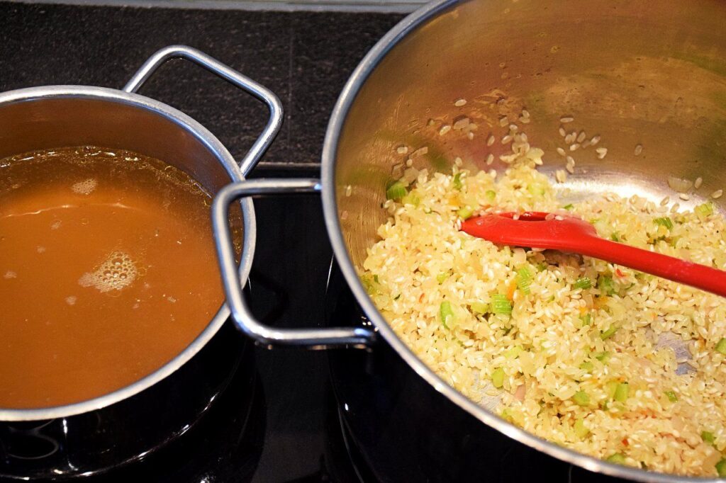 Dann schneide ich das Gemüse klein und erhitze den Rest der Suppe. Die Zwiebel- und Selleriewürfel sowie den gehackten Knoblauch schwitze ich in Öl an, dann kommt der Reis und eine kräftige Prise Salz dazu.
