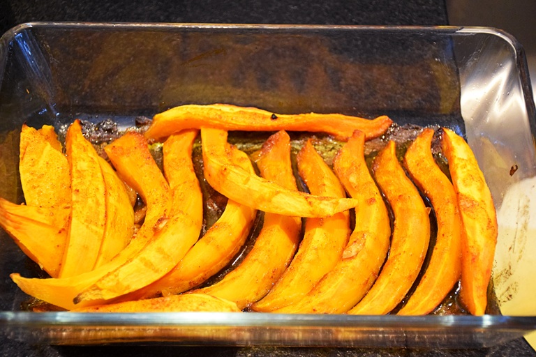 So heize ich den Backofen auf 200° vor, schäle das fragwürdige Gemüse, entferne gerne die Kerne und schneide ihn in 2 cm dicke Spalten. Auf einem Blech vermische ich den Kürbis mit beherzt eingesetzten Gewürzen, Salz, Pfeffer und etwas Olivenöl, dann backe ich ihn für 30 Minuten. Ein paar Spalten bewahre ich als Deko auf, den Rest püriere ich mit 100 ml der Suppe.