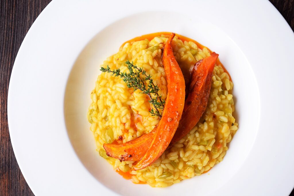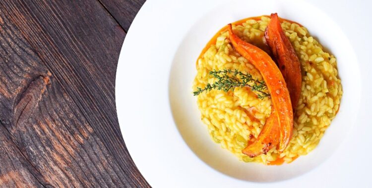 400 g Risottoreis, 1,5 l klare Gemüsesuppe (noch besser: selbstgemachte Hühnersuppe), 1 kleine Zwiebel, 2 Stangen Sellerie, 1 Knoblauchzehe, 40 g Butter, Olivenöl, Zitronensaft, Salz, Pfeffer; 400 g Speisekürbis, etwas Zimt, Koriander und Chili, Thymian als Deko