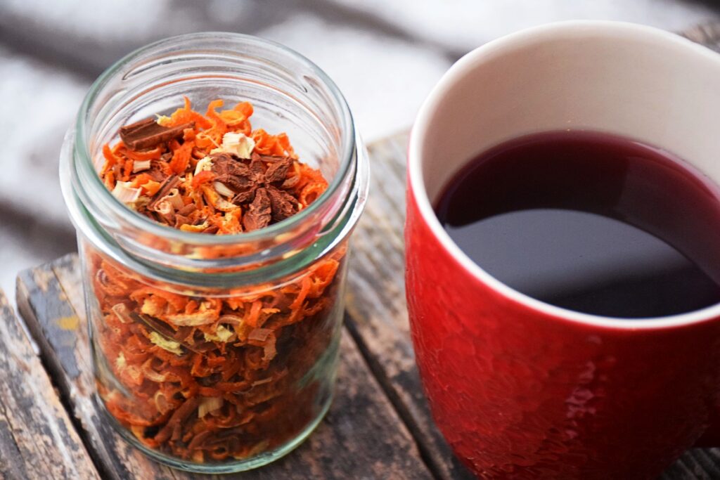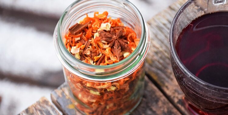 Zurück in die Advent-Küchenwerkstatt: Nach dem Auskühlen fülle ich das großartig duftende Gewürz in Gläser oder Teebeutel ab. Für alkoholfreien Winterpunsch koche ich eine Mischung aus je 500 ml Wasser und Traubensaft auf und lasse einen gehäuften EL der Gewürzmischung im Teebeutel 10 Minuten darin ziehen.