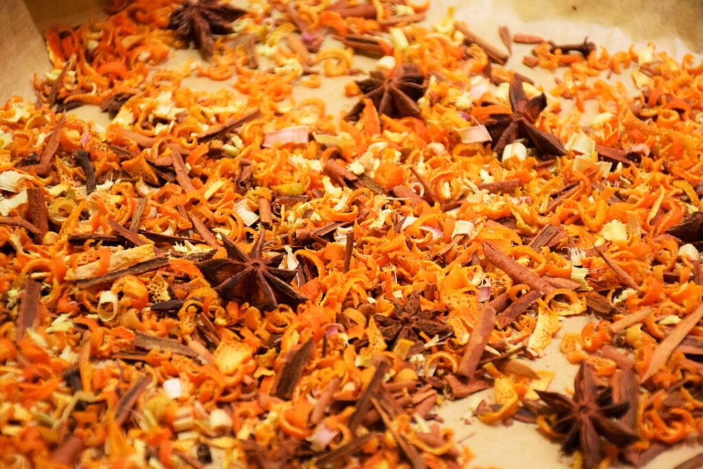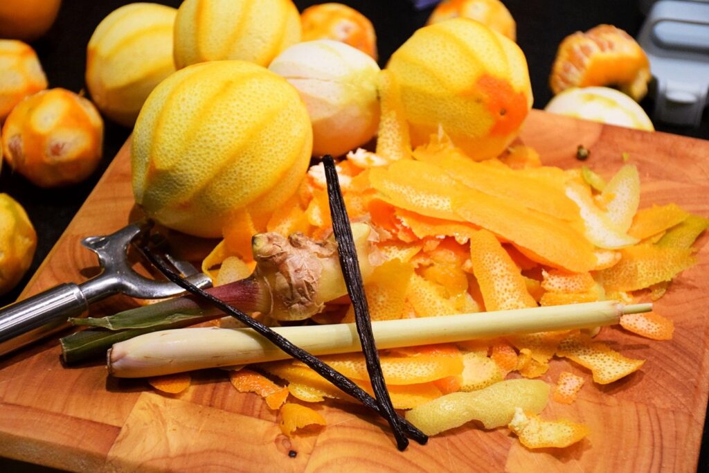 10 kl. Zimtstangen, 10 Sternanis, 20 Nelken, 1 TL Kardamom, 1 Stück Ingwer, 2 Vanilleschoten, 15 Bio-Zitrusfrüchte (Orangen, Mandarinen, Zitronen), weitere Zutaten nach Ihrem Geschmack – etwa Zitronengras, Lorbeer oder …!?