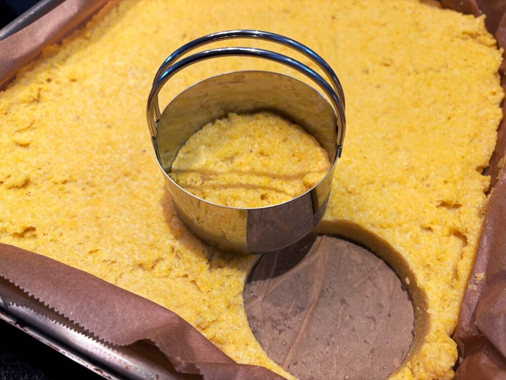 Dann widmen Sie sich wieder dem Blech mit der erkalteten Polenta. Stechen Sie mit einem runden Ausstecher – notfalls einem Weinglas – Kreise aus und braten sie die Polenta in etwas Öl oder Butter in einer beschichteten Pfanne beidseitig goldgelb an.